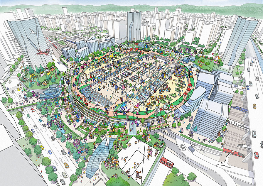 熙熙攘攘的巨大环状空间“Transit Loop”将被轨道分割的城市重新连接起来。环状空间外侧伫立着办公和商业等综合设施。
