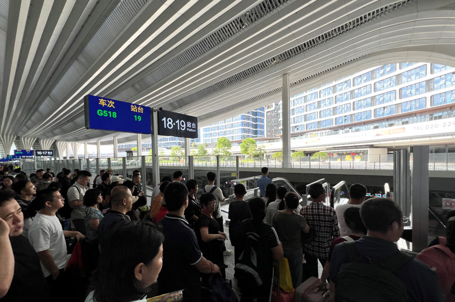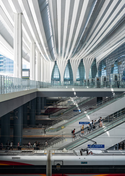 丁炳均:透过高铁车窗望向白云站,轨道上方的高楼大厦映入眼帘,感觉列车就像直接钻进了城市地下。一般的车站直接到达昏暗的站台后乘搭体验就结束了,但在白云站的站台上可以透过挑空看到城市空间和天空等户外的风景。这种白云站独有的空间体验令人印象深刻。