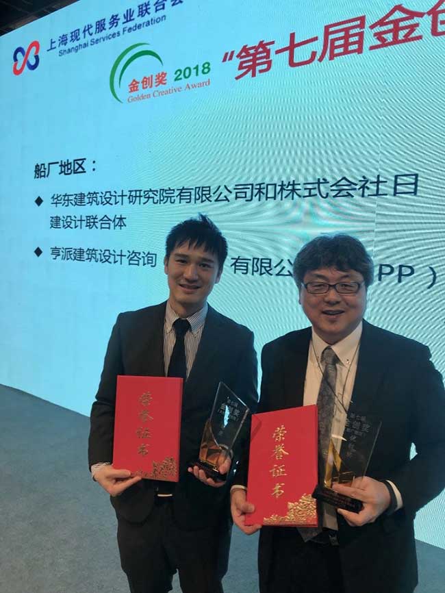 由日建设计和华东建筑设计研究院携手打造的「杨浦滨江船厂地区综合开发实施方案」荣获2018年“第七届金创奖”— 杨浦滨江船厂地区和大桥公园地区综合开发实施国际征集大赛「优胜奖」。本次大赛由上海现代服务业联合会、上海杨浦滨江投资开发有限公司联合主办,上海经纬建筑规划设计研究院股份有限公司承办,旨在建设一个环境优美、空间舒适、宜人宜行宜业的滨江。