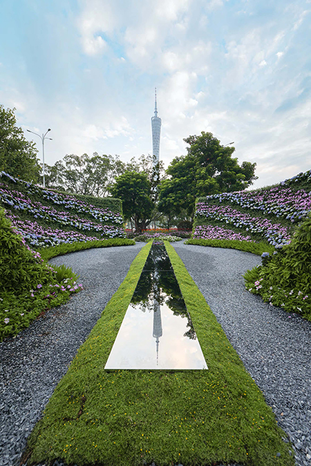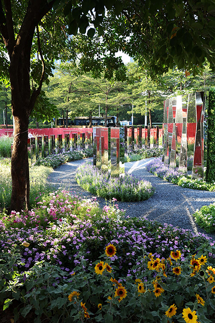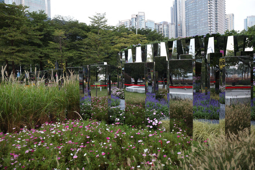 设计团队以“时空容器”为主题,选择镜面材料为主媒介,通过折射与重组城市地标和花境,构建了一个让观者在游园中穿越时空、感知城市记忆延续的沉浸式体验。展园的多面空间演绎灵感源自日本传统工艺“切子”与纹样“矢来”,结合多面镜与螺旋式植物布局,营造出虚实交织的空间秩序。镜面弱化边界,花海动线串联,最终进入象征“切子”的圆形构筑物,满墙花海如瀑布般倾泻,展现花卉与广州的蓬勃生命力。