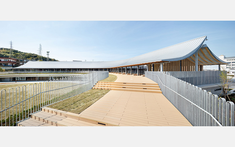 在用地中央的开放式空间“大型庭院”周围,利用场地高低差设置了周长约300m的散步道。其中一部分作为“阶梯花园”呈阶梯状攀升,并连接2F露台的东端。西侧利用既有地形,设置了由传承地理历史的纪念碑和移栽树木构成的连接节点“历史之丘”,从而实现了从地面到2层的连接。这样通过围绕庭院设计立体连续的回游动线,旨在通过弓形的建筑形式,使活动形成环状连锁反应。此外,利用地势、雨水流动和植被,将雨水引导至利用现有地形形成的凹地,从而集中了集水功能。通过促进雨水对大地的涵养,不仅能抑制暴雨时的雨水径流,还能形成根植于天草地区的绿色湿地景观。通过以上设计,实现了多功能的“环境包容体”,不仅与十万山等地区的自然环境和谐共生,还呈现出园路丰富的步行体验,更在广场上创造出多样化的活动。