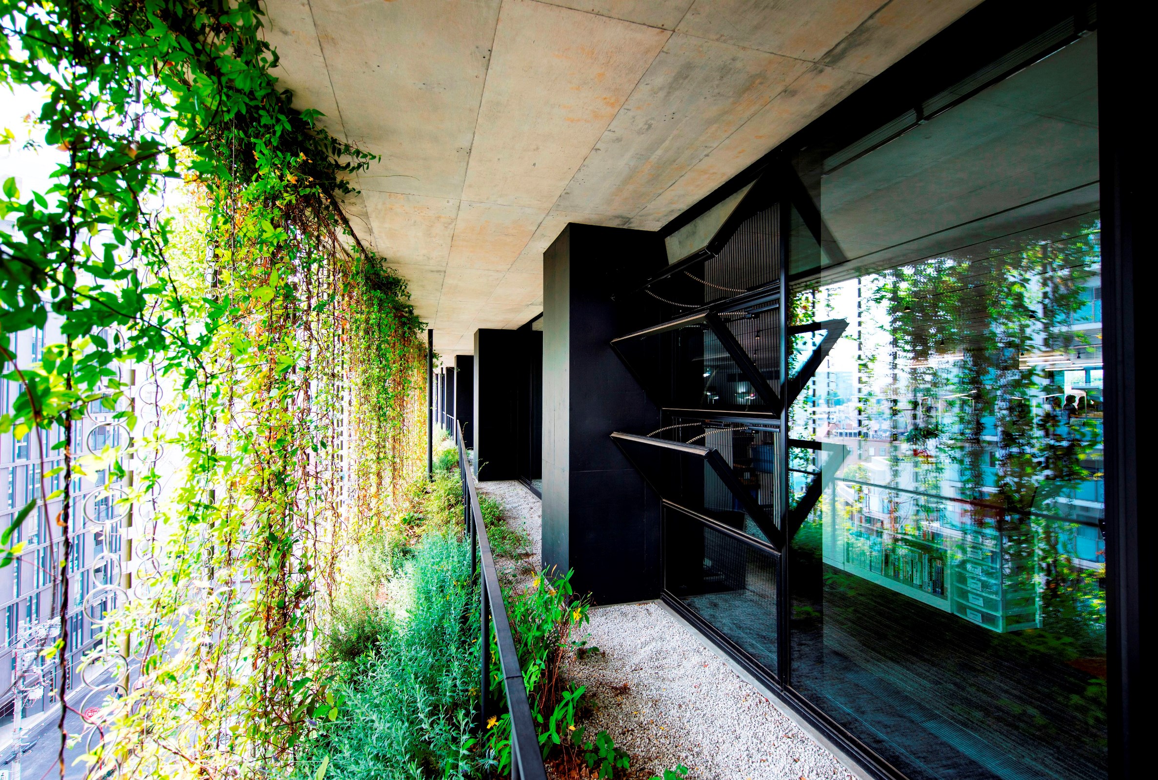 从地震中汲取受灾的经验教训,致力于「安心」与「环保」的出租型写字楼。通过采用无悬挂材料的顶棚,以及将空调机安装于地板下等措施,提高了安全性。种满香草和常春藤的绿化阳台,在打造出清新的办公场所的同时,还有助于抑制热岛效应。此外,通过导入各种节能技术,实现可自行调节的舒适的办公空间。