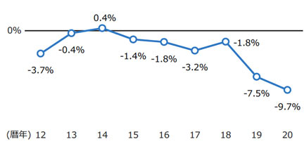 Future capital investment plans for the private sector, the real estate and service industries, which account for 50% of private construction orders and have a large impact on the construction industry, show signs of weakening investment motivation in FY2021 (Fig.4 & 5). Furthermore, unless the circumstances after Covid-19 can be illustrated, it is very likely that many capital investments will be frozen which will result in a continuing competitive environment for receiving orders and construction prices will continue to decline.