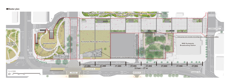 The site area is 1.5 ha, and it is a “large hall in the town” that is connected to Kumamoto Castle and its gardens