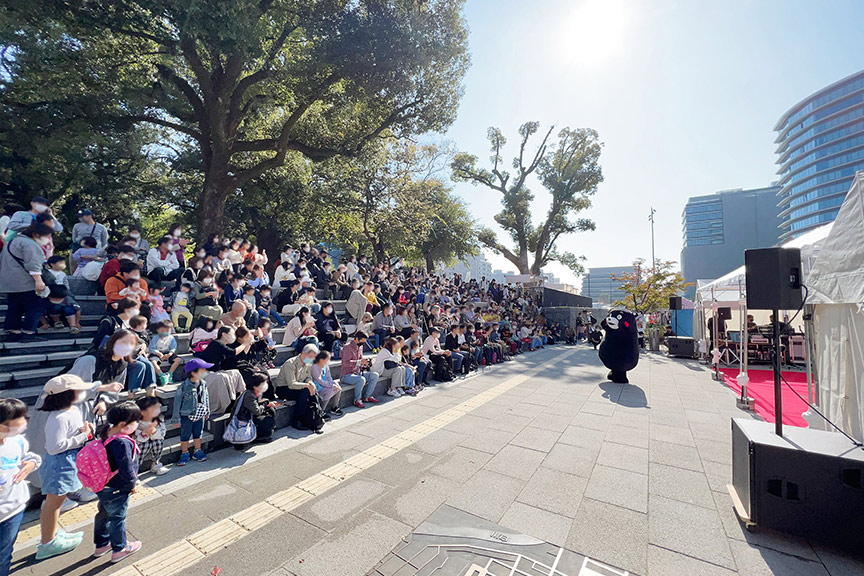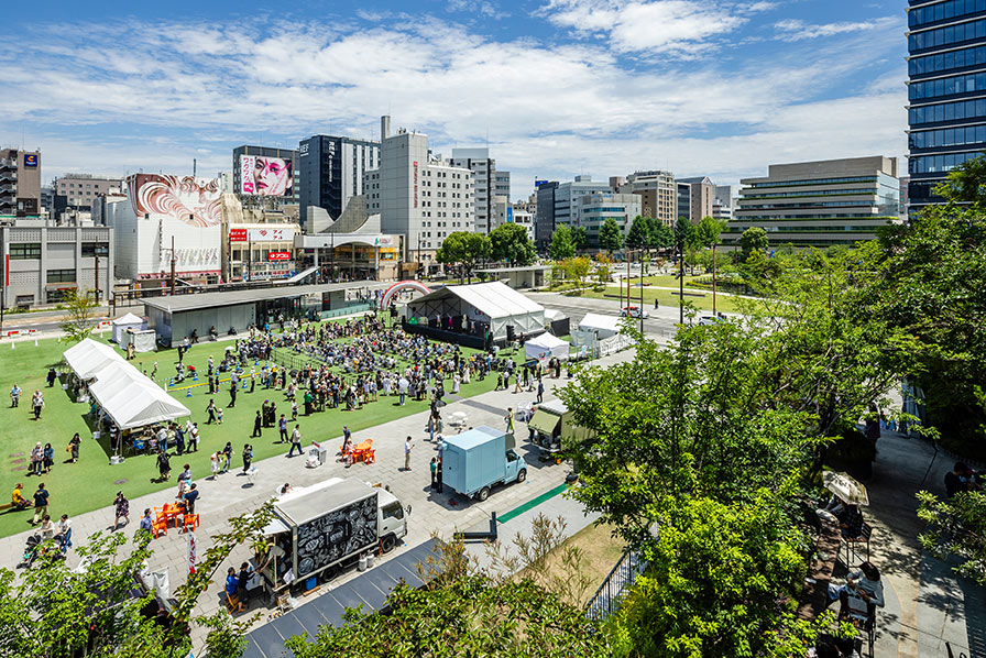 The concept is “a large hall in the town, with Kumamoto Castle and a garden adjoining it.” In the planning, the approx. 230 m road in front of the old bus terminal was closed to traffic and turned into a completely pedestrian space. The aim was to connect the various sites and create a new landmark for the town.