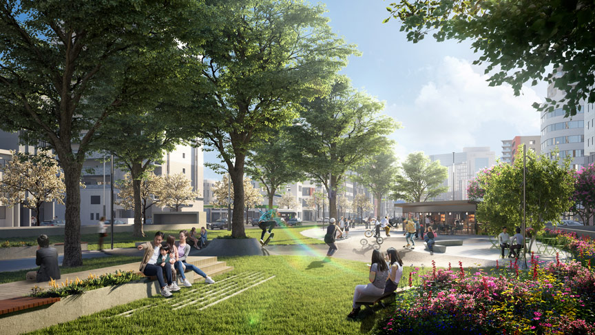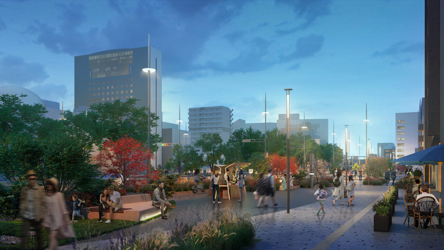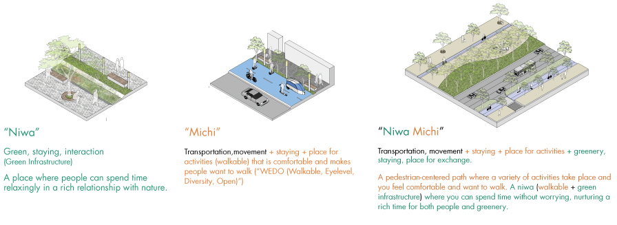The concept of the basic plan, "niwamichi," combines "niwa" (garden), which serves as a green infrastructure to create high-quality spaces through interaction with nature, with "michi" (path), a walkable area that also functions as a place for activities and gatherings.