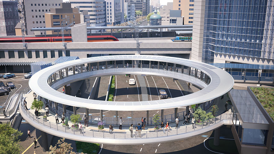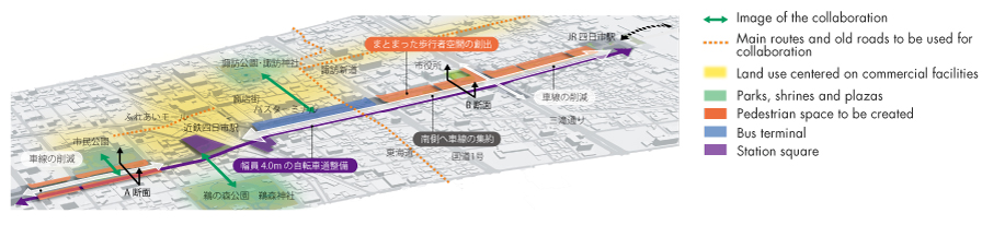 The plan is to create two cores, Kintetsu Yokkaichi Station and JR Yokkaichi Station, and to transform the urban axis that connects them. The aim is to improve the area's walkability and spread the hustle and bustle of the area around Kintetsu Yokkaichi Station to the whole town, not just the streets along the station.
