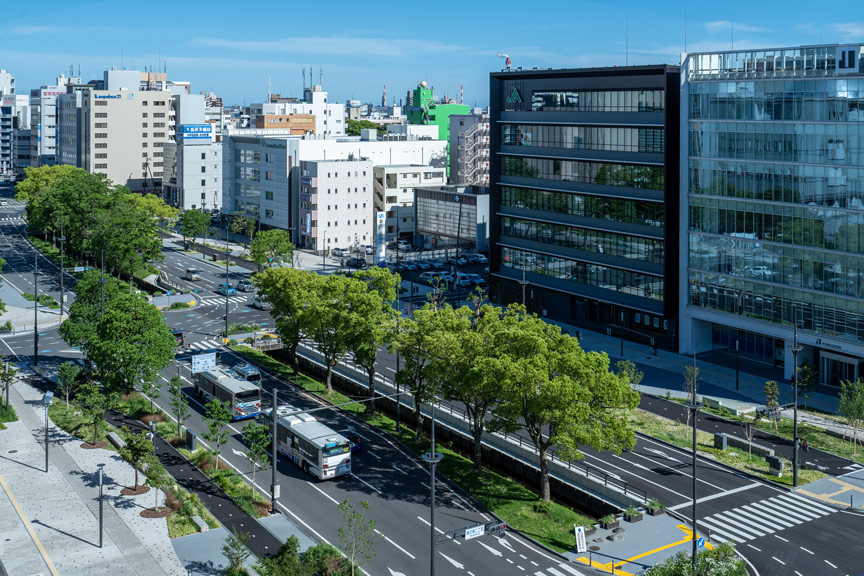The road, which was once used as a main road for the feudal lord's official attendance service to the Edo Shogunate, inherited the image of the Hirokoji, a characteristic feature of the castle town, and was divided into modules called “Hiroma” based on the traditional Japanese shakkan-ho measurement system, with each module measuring 15 ken (approx. 27 m). This design has also been adopted in the ongoing development projects in the surrounding area, and is a design shared by both the public and private sectors.