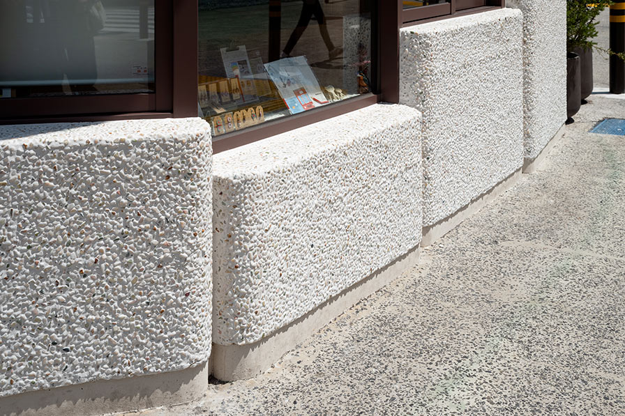 ——The building features numerous windows, with window frame sizes and counter heights varying according to function -- such as information desks and takeout counters.