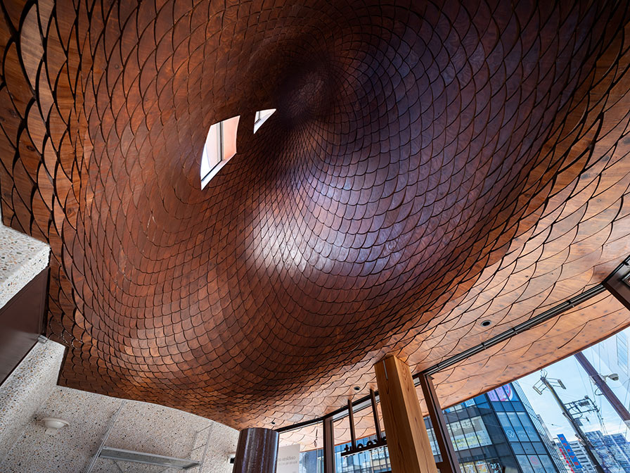 ——We paid meticulous attention to finishes, including the copper roof, with wooden panels installed on the ceiling and eaves.