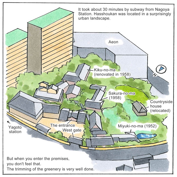 Hasshoukan is located near Yagoto Station on the Tsurumai Line, about 30 minutes by subway from Nagoya. Looking at the photo, you’d think it’s located in the suburban mountains. Surprisingly, the whole area is surrounded by greenery amid an urban landscape.