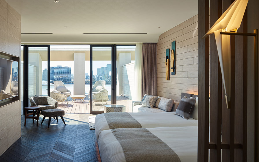 This new hotel project is located in front of the National Stadium in Jingu Gaien, an area of lush greenery and historical and cultural facilities in the city’s heart. We proposed a new way to stay that combines the urban sense of Tokyo with the relaxed atmosphere of a resort. The design inspiration is drawn from the light, shadow, and natural springs of the forest. Jingu Gaien’s forest attributes are expressed in the hotel’s furniture and artwork. Guest rooms each have balconies made of Japanese cedar, with refreshing views on all sides. Wooden lounges are placed near windows to maximize the notion of coexistence with the rich outside space. The building seamlessly connects the interior and the exterior, from “relaxation space → window space → balcony → landscape,” and expresses “the refined slow life” yielded in the so-called "precious blank space" left in Tokyo’s wake.