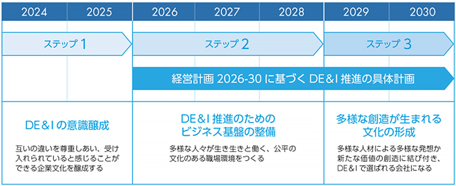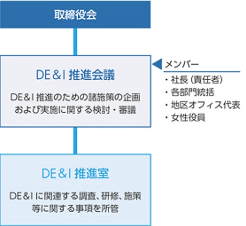 上記推進宣言に基づき会社として定量的な目標および定性的な活動計画を定め、2025年に DE&I推進の全体活動の中核を担う「DE&I推進室」を発足しました。同室は事業部門と管理部門のさまざまな専門領域から多彩な人材が集まっており、計7人が結集してスタートしました。所属部署だけでなく、子育てに介護、外国籍や地方居住など、各メンバーのバックグラウンドや働き方も多彩で、それらの多様な価値観や経験を活かした施策の立案、展開を図っています。また、社長が議長を務める「DE&I推進会議」を年4回開催し、部門ごとに定めた「2030年までの目標」の進捗確認を行い、適切なロードマップの設定と目標達成に向けた着実な施策の実行を目指しています。