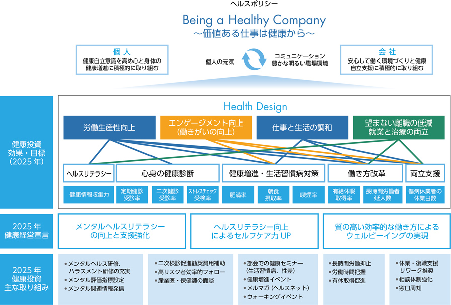 「健康デザイン21-25」で掲げる様々な取り組みは、結果的に個人と会社の活力向上を実現するものとして、健康経営の視点で実施する。