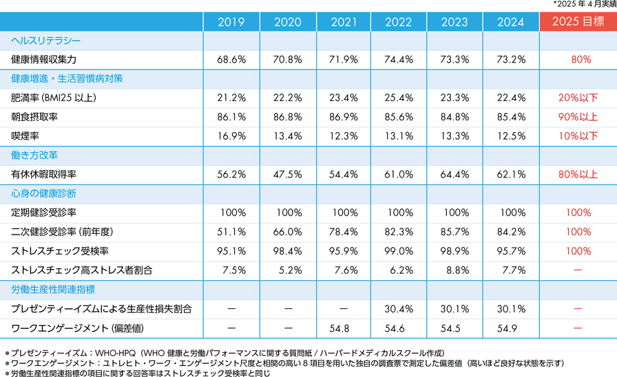 2017年以降、当社では中期健康経営計画「健康デザイン活動計画」を策定の上、健康指標に対する具体的な数値目標を設定しています。また、その達成状況を適宜取締役会へ報告し、健康増進施策の有効性を確認しています。