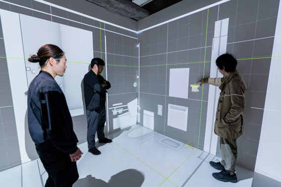 設計段階では3Dモデルを原寸大の三面図として投影し、位置や寸法を高い精度で確認します。寸法だけでなく、タイルや木といった素材も原寸で体験できます。つまりこれまでは模型やモックアップで検討していた内容を、XR STUDIOの映像技術を使えばより身体的に捉えて吟味することができ、設計に生かせるようになりました。