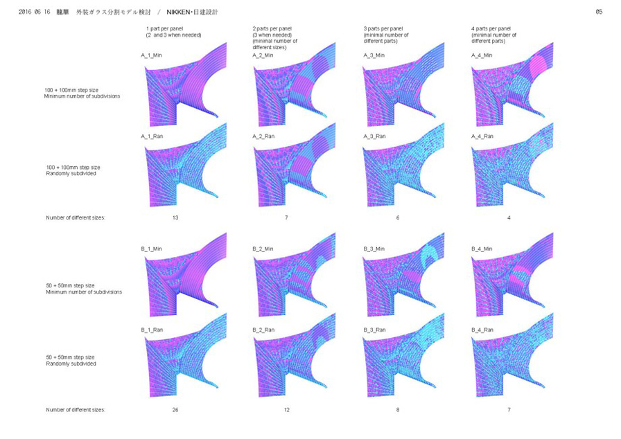 「上海AI TOWER」では、曲面ガラスの形状について、施工しやすいガラスの分割方法をDDLが検討しました。平面矩形だけで成り立ち、かつ、なるべく同じサイズのガラスになるようパネル割を検討していきます。全部で何パターンに分割すればよいかをコンピュータ・シミュレーションで検討。複数のパターンを比較検討できるのが、コンピュータ・シミュレーションを使うメリットです。