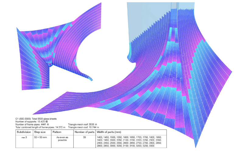 最終的には、なめらかな曲面を維持しつつも施工性・経済合理性も満たす39種類のガラスに収斂させていきました。