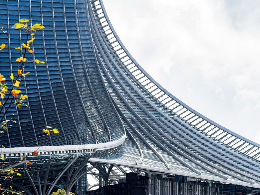 フリーフォームで描いた曲面形状の合理的で経済的な実現を、日建設計はDXのひとつとして実践しています。日本の基本設計にあたる初歩設計を日建設計が担当した中国の「上海AI TOWER」では、この建築全体のデザインモチーフとなっている「風」を表現するため、曲面ガラスで覆った低層部の屋根をいかに原案通りに施工できるかが課題となりました。