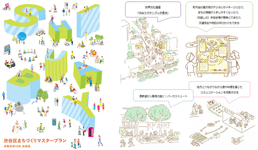『渋谷区まちづくりマスタープラン』の表紙(左)と、中面に掲載された「渋谷民が描く未来像」(右)