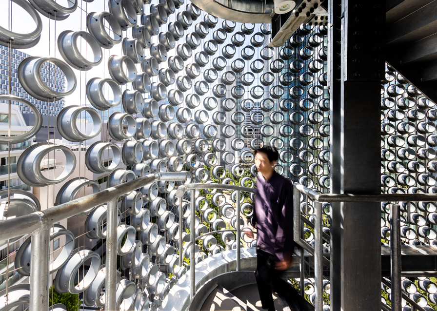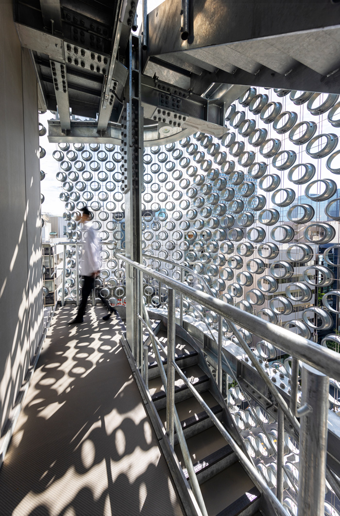 円筒形の金物をワイヤーで繋げた外皮で覆われた「神保町SFI」 🄫野田東徳[雁光舎]