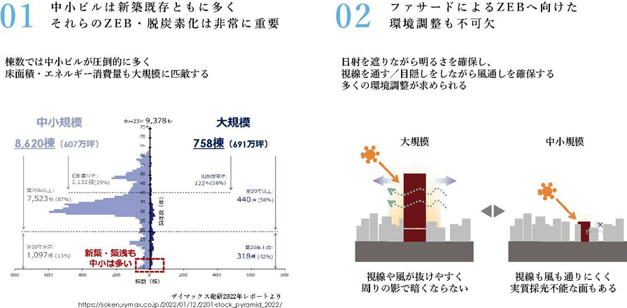 中小ビルは新築、既存ともに棟数が多く、ファサードによるエネルギー消費の抑制、環境調整へのニーズが高まっている