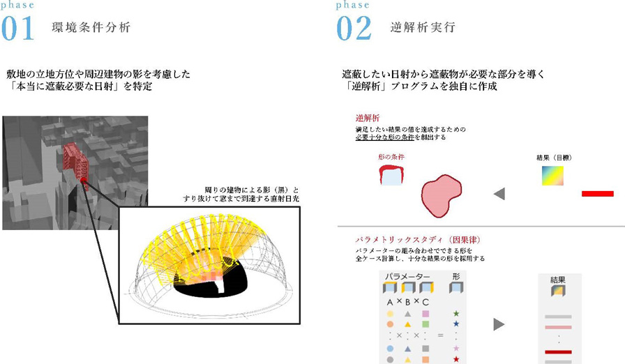 太陽の動きと周辺にある建物などとの関係を細かく分析し、遮蔽が必要となる日射から、遮蔽物の位置や形を逆解析