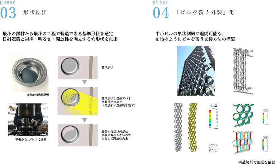 中小ビルでは、設備バルコニーや避難階段など建築の裏側が表面に出てしまうことが多いところを、すっぽりと外皮で覆うことで、街並みの改善にも貢献しています。完成後、この金型越しに射す日射しの輝度を検証したところ、人が心地よいと感じる木漏れ日と似た光環境であることが明らかになりました。中小ビルを覆う外皮のデザインで、環境負荷を抑え、人が心地よいと感じる空間を創出するEnvi-lopeシリーズは、その第2弾が現在進行形です。
