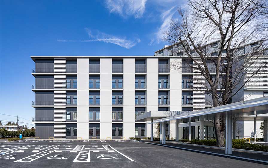 相模原キャンパスの新病院再整備計画。既存病院(東館)に隣接して病院本館整備と既存改修を行った。さらに東病院の閉院に伴う移転計画として、西館を本館に隣接して整備。庇やロータリーからなるフロントラインを延長することにより、機能連携を図れるようになった。外壁設備シャフト、ISS 設置、2重床、極細間柱を採用し、医療環境の変化に追随する医療空間を実現。病棟はスタッフステーション・ナースピットを中心に、患者への動線短縮を図った。国土交通省の住宅・建築物省CO2先導事業に「北里大学病院スマート・エコホスピタルプロジェクト」が選定されエコシャフト自然換気、太陽光発電、給湯を採用した。