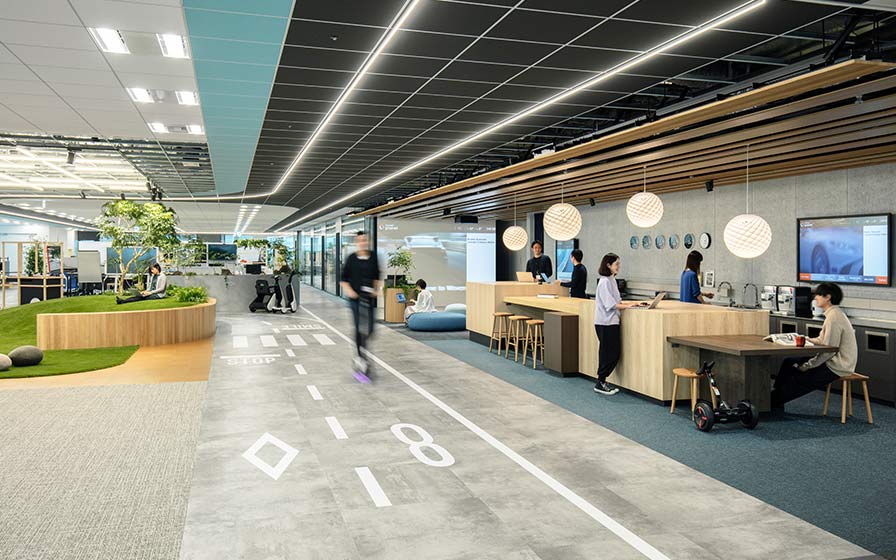 Woven by Toyotaは自動運転技術、ソフトウェア開発を行い、また近年では実証実験の街であるToyota Woven Cityを企画する企業である。オフィスには幅3.6m、全長約200mの「ストリート」が一周ぐるりと巡り、パーソナリティモビリティに乗った社員やロボットが行き交う。