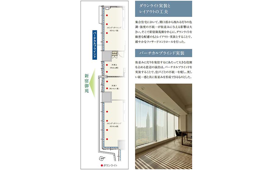 広大な新宿御苑に面しており、南向きの住戸からはその緑を一望できる、希少な立地のに位置する分譲集合住宅である。 「新宿御苑に住まう」をコンセプトとして、立地の特性から、新宿御苑を「取り込む」「感じる」「溶け込む」という3つのキーワードを抽出し、環境を最大限享受しつつ景観に溶け込むことができる住宅であることを目標とした。バルコニー配置の調整やガラス主体のファサード、バーチカルブラインドの実装等の計画によって、この地域にとっても街並みを望ましい形へと導いていくことのできる建築となった。